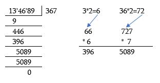 ახლა ჩამოვიტანოთ დარჩენილი ორი ციფრი 89, გავიმეოროთ იგივე, ახლა უკვე მიღებული 36*2=72, მას მივუწეროთ მარჯვნიდან და ქვეშ ერთი და იგივე ციფრი და გავამრავლოთ, ჩვენს შემთხვევასი 7 და ასე გავიმეოროთ სანამ ჩვენი რიცხვის ბოლო წყვილს ჩამოვიტანთ.