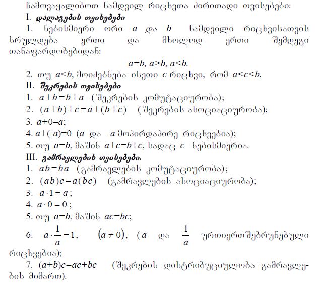 შენიშვნა: მათემატიკური ცნებები ძირითადად წარმოდგენილია ეროვნული მისაღები გამოცდებისთვის განკუთვნილი სახელმძღვანელოდან - ავტორები: ს.თოფურია, ვ.ხოჭოლავა, ნ.მაჭარაშვილი, გ. აბესაძე, ზ. მეტრეველი.