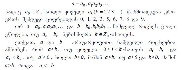 ნამდვილ რიცხვთა სიმრავლის განსაზღვრებიდან გამომდინარეობს, რომ ყოველი ნამდვილი რიცხვი ან რაციონალურია ან ირაციონალური. რადგან ყოველი რაციონალური რიცხვი შეიძლება წარმოვადგინოთ უსასრულო პერიოდული ათწილადის სახით, ხოლო ირაციონალური უსასრულო არაპერიოდული ათწილადის სახით, ამიტომ შეიძლება დავასკვნათ, რომ ყოველი ნამდვილი რიცხვი შეიძლება წარმოვადგინოთ უსასრულო ათწილადის სახით შემდეგნაირად: