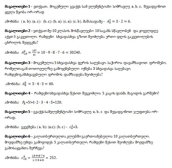 ხშირად საჭიროა სასრული სიმრავლის ელემენტებისგან სხვადასხვა კომბინაციის შედგენა და რაიმე წესით შედგენილი ყველა შესაძლო კომბინაციის რაოდენობის გამოანგარიშება. ასეთ ამოცანებს კომბინატორულს უწოდებენ, ხოლო მათემატიკის ნაწილს, რომელიც დასახელებული ამოცანების ამოხსნას შეისწავლის - კომბინატორიკა.