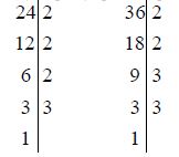 ე. ი. 24 = 2 ⋅ 2 ⋅ 2 ⋅ 3 ან 24 = 22 . 3 და 36 = 2 ⋅ 2 ⋅ 3 ⋅ 3 ან 36 = 22 . 32, ამიტომ D(24,36) = 2 ⋅ 2 ⋅ 3 = 12. რადგან 24-ისა და 36-ის გაშლაში რიცხვი 2 საერთო მამრავლად შედის 2-ჯერ, ხოლო 3 ერთხელ.